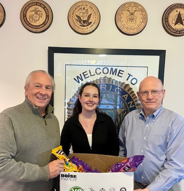 CANDY FOR THE TROOPS – – Abby Dowd (center), a senior and president of the Johns Creek High School Spanish Club delivers another box of candy for Post 201’s Boxes for the Troops program. During the past three years, the JCHS Spanish Club has donated some 600 lbs of candy which has been shipped to members of the armed forces serving overseas. Receiving the candy on behalf of the Post are Legion members Ralph Jordan (left) and Jim Davis (right). The sweet treats were collected through donations made to the Spanish Club during their annual trunk or treat event. “It’s our way of showing appreciation to the men and women for their service and defending our freedom,” Abby said. Members of the Post estimate they have shipped more than 13,000 boxes to the troops during the past 20+ years the Post has maintained the program. Click here to read a Nov. 22, 2022 article published by Appen Media about the Post’s “Boxes for the Troops” program.