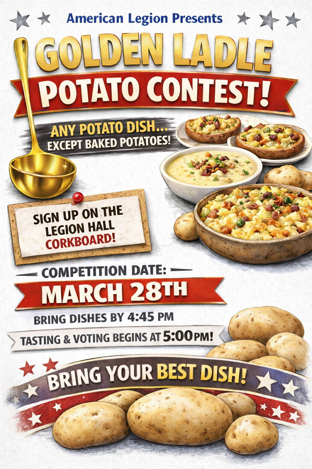 Competition for best potato dish and anything but baked potatoes! Bring your BEST potato dish. Sign up in advance PLEASE!